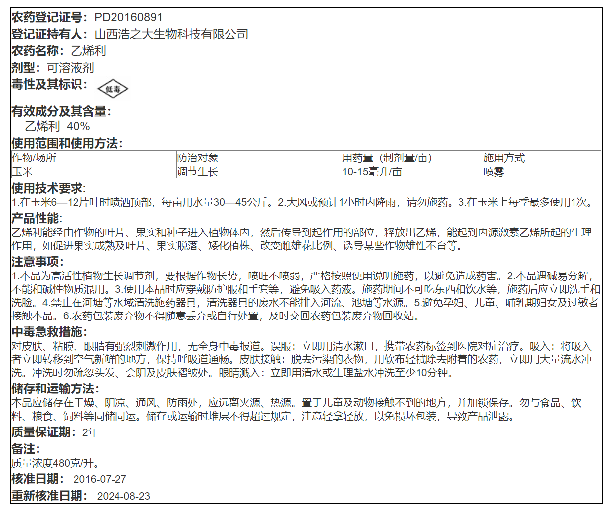 40%乙烯利可溶液剂网签