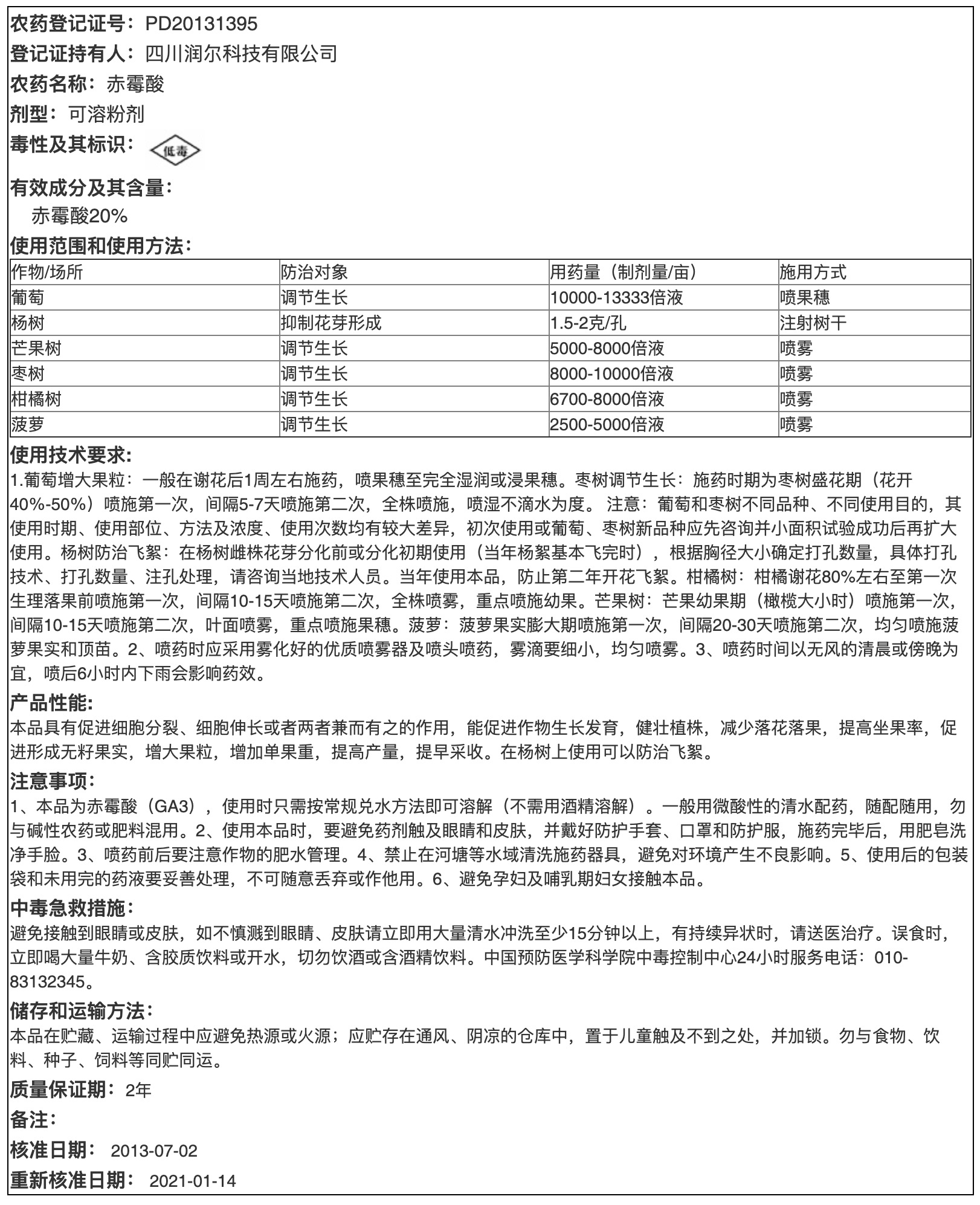 20%赤霉酸可溶粉剂说明书管理信息