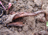 为根系真菌病害。从根部发病,初在皮层上出现黄褐块斑,逐渐变黑,软腐,向下扩展到整个根系变黑腐烂,流出棕褐色汁液,有酒糟味,木质部变为淡黄色;后期病组织内充满白色菌丝;地上部症状叶片萎蔫死亡,严重时整株死亡。根腐病主要在高温高湿季节发病,由病残体传播,接触传染。