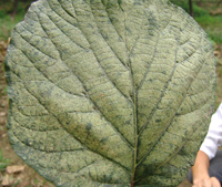 4月中旬,病原菌由叶背面开始侵染,为侵染的初期。5-6月份,气温20-24℃,更有利于侵染,此时期是侵染高峰期。7-8月为发病高峰期(此时期高温高湿)叶部症状明显,开始是小病斑,后逐步扩大,叶片后期干枯,大量落叶。到8月下旬开始大量落果。
