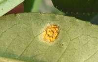 主要为害成熟或近成熟叶片。叶片染病叶背面现黄色、裸露的夏孢子堆,大小0.2—0.4mm,圆形至椭圆形,包被破裂后变为橙黄色,后又褪为浅黄色,在与夏孢子堆对应的叶正面现红褐色斑块,秋后又形成冬孢子堆,圆形,大小0.2—0.7mm,橙黄色至暗黄色,严重时孢子堆扩展至全叶。