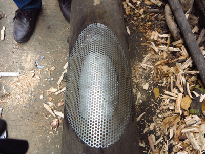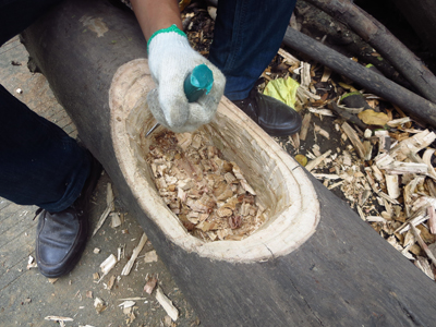 1、在树干上用锉刀挖出一个树洞,将树洞边缘及底部修整平(图1);