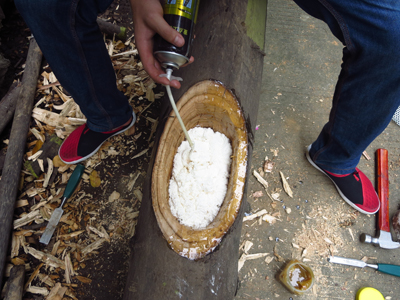 3、防腐材料涂抹好后,放置一段时间,晾干后,用聚氨酯泡沫填缝剂从底部开始填充树洞(图3);