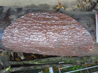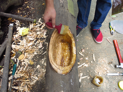 2、用ACQ木材防腐剂或熟桐油分别涂刷挖好的树洞,一种防腐材料涂抹一半的树洞(图2);