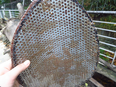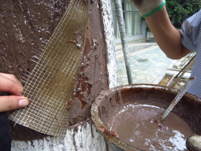 4、用剪刀剪下一块与树洞洞口大小一致的铁皮(图4)及制作好的仿真树皮,将国光仿真树皮专用胶及颜料调匀,涂抹在仿真树皮背面后,将仿真树皮粘贴在剪好的铁皮上(图5);