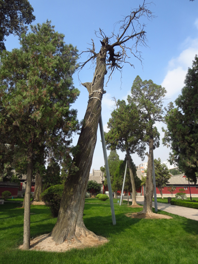 (3)人为的危害及其土壤理化性质降低。伏羲庙里游人密集,地面践踏频繁。致使土壤板结,通气不良;有的树干周围铺装面积过大,仅留下很小的树盘,影响了地上与地下气体交换,使古树处于透气性极差的环境中。造成土壤理化性质变坏,加速了古柏树的衰老。