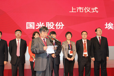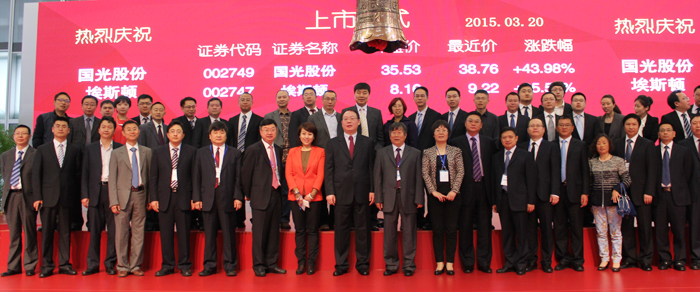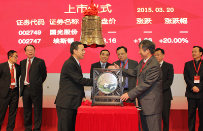 2015年3月20日上午,四川国光农化股份有限公司上市仪式在深圳证券交易所隆重举行。公司董事长颜昌绪,资阳市委书记、市人大常委会主任周喜安、农业部药检所总农艺师季颖、中国农药工业协会会长孙叔宝、中共资阳市委常委郎宽、资阳市人民政府副市长毛绍百、简阳市人民政府市长赵春淦等政府主要领导及公司董事、监事、高管出席了上市仪式。