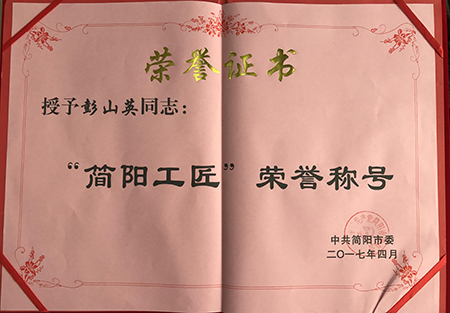 研发部彭山英荣获2017年首届“简阳工匠”称号