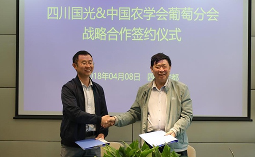 2018年4月8日,中国农学会葡萄分会会长刘俊、秘书长张鹤莅临国光,与国光总经理颜亚奇就葡萄产业现状与种植技术变革进行了交流,双方在友好协商、互相促进的前提下签署了战略合作协议,国光有幸成为了中国农学会葡萄分会第一家战略合作单位。
