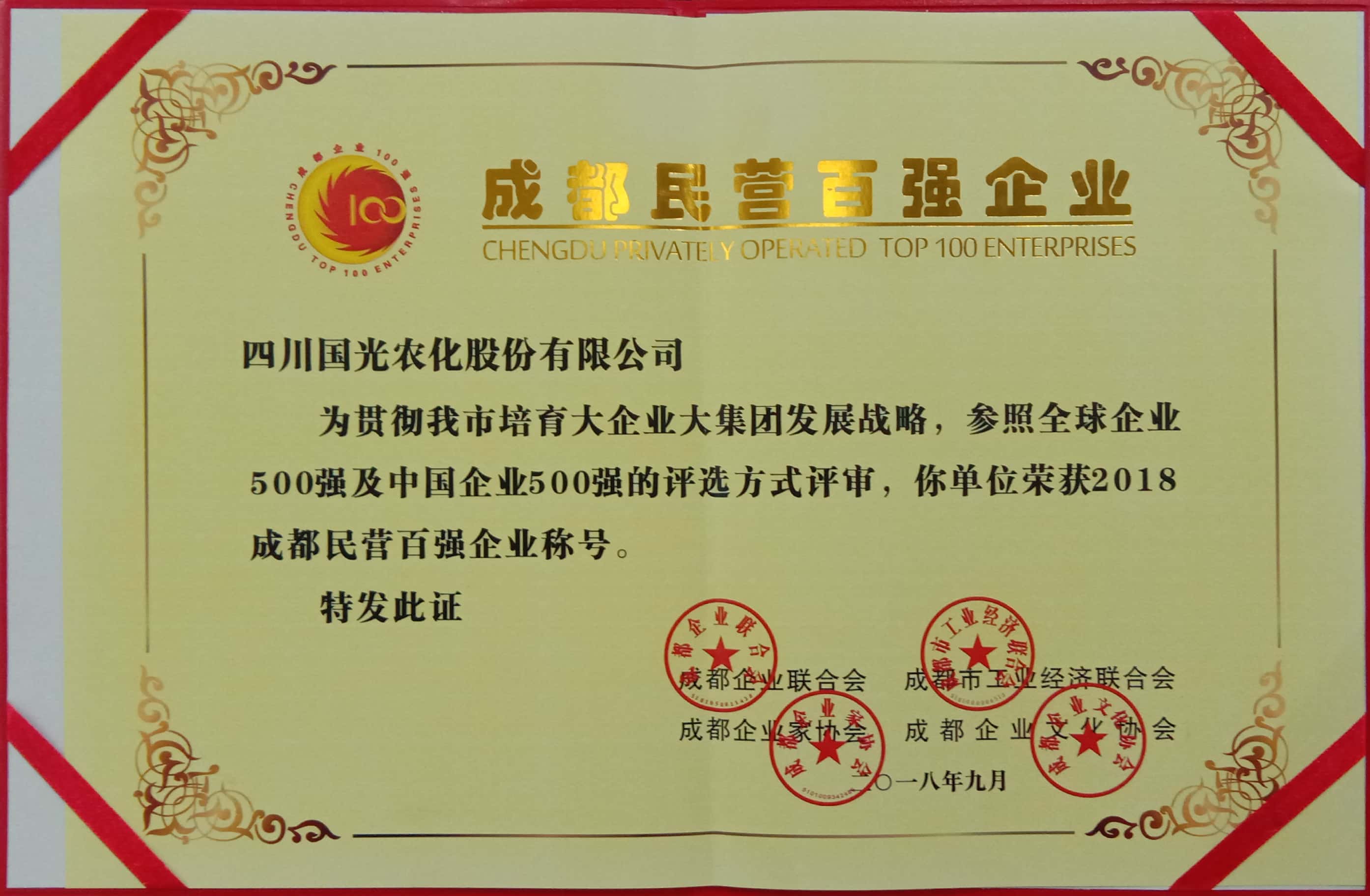 国光股份凭借优异经营业绩和强劲增长势头,获得“2018成都企业100强”荣誉称号。