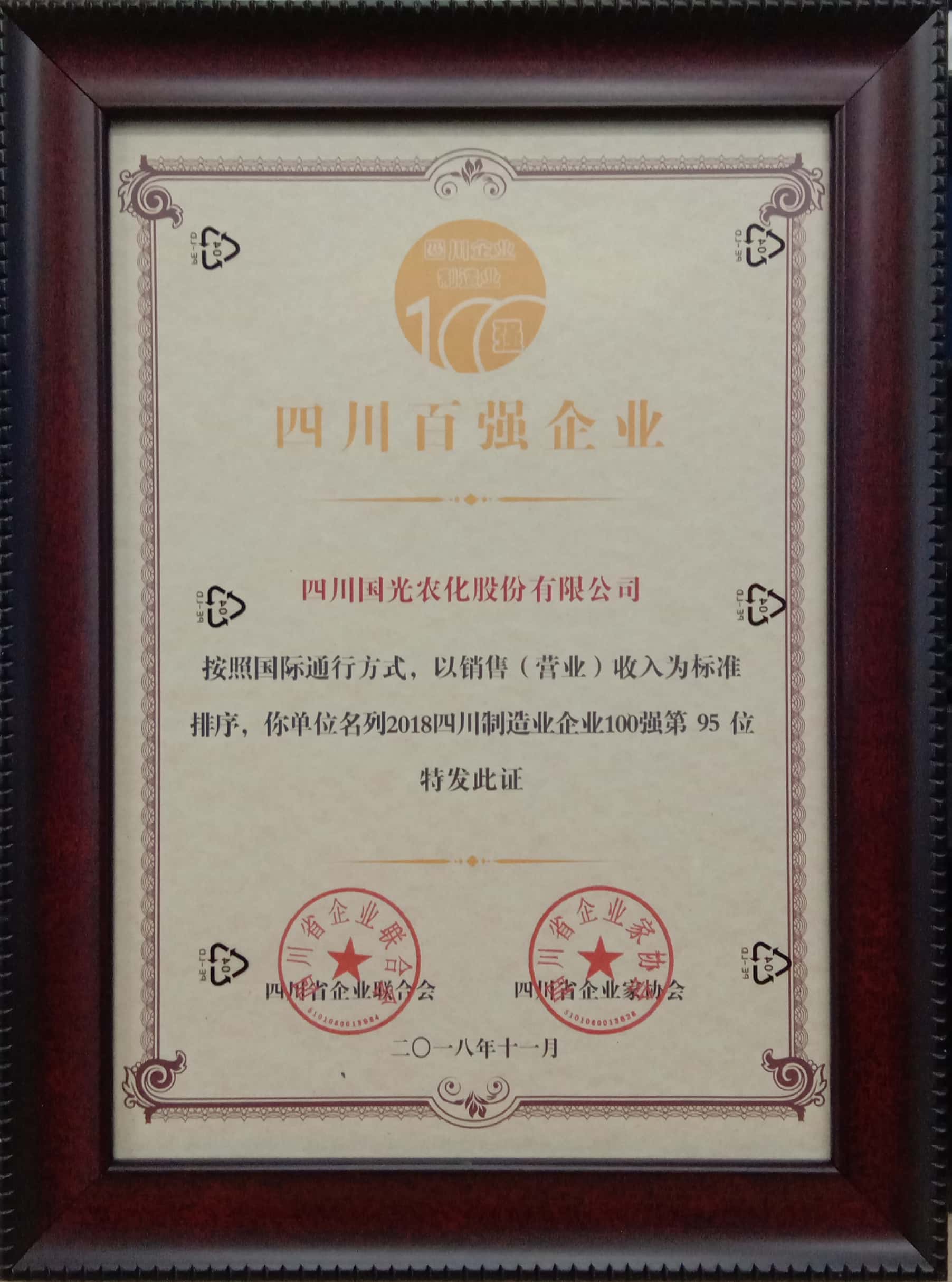 在这次评选活动中,国光股份荣获“2018四川省制造业百强企业”荣誉称号。
