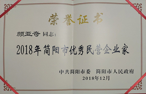 公司被授予“2018年简阳市优秀民营企业”,公司总经理颜亚奇被授予“优秀民营企业家”。