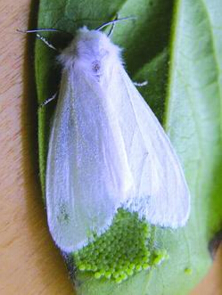 成虫 白色中型蛾子,体长13—15mm。复眼黑褐色,口器短而纤细;胸部背面密布白色,多数个体腹部白色,无斑点,少数个体腹部黄色,上有黑点。雄成虫触角黑色,栉齿状;翅展23-34mm,前翅散生黑褐色小斑点。雌成虫触角褐色,锯齿状;翅展33—44mm,前翅纯白色,后翅通常为纯白色。